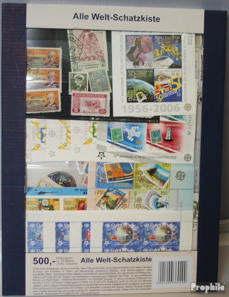 (234) Eine Stöberkiste, die es in sich hat: Über 750 großenteils verschiedene Marken aus vielen Ländern Europas und Übersee. In Tüten, auf Steckkarten, postfrische Marken, viele Motivausgaben, viele komplette Sätze, Vorkriegsmarken, Marken mit Aufdruck, kleine Raritäten, ein paar Briefe und Belege etc. Dabei auch viele Blöcke, Bögen und Kleinbögen, inklusive dem Highlight der Kiste: 12 rare postfrische Blöcke und Kleinbögen - teilweise Blockserien - von 2005/06 Europa (1 davon mit einem Postpreis von bereits € 5,50) und einem Katalogwert in Höhe von € 287,-!!!!! Zusätzlich auch ein Druck von Michael Jackson. Beim diesem Gesamtkatalogwert ist diese Kiste eine echte Gelegenheit!!! Zusätzlich noch eine DIN-A4-Klarsicht-Einsteckhülle mit 6 Zeilen zum Abheften in einem A4-Ordner. Dieses Produkt ersetzt eine Plastik-Verpackung und ist gleichzeitig ein nützliches Sammlerprodukt. Dabei noch ein Gutschein über € 50,- Katalogwert für Erstkäufer bei www.prophila.de*Nur durch den Zusatz "Originalabbildung" gekennzeichnete Bilder sind mit dem angebotenen Artikel identisch, ansonsten kann die Originalware betreffend Stempel, Aufdruck, etc. von dieser Abbildung abweichen, weil von jeder Ausgabe nur ein Bildersatz zur Verfügung steht (bei Briefmarken meist postfrisch).