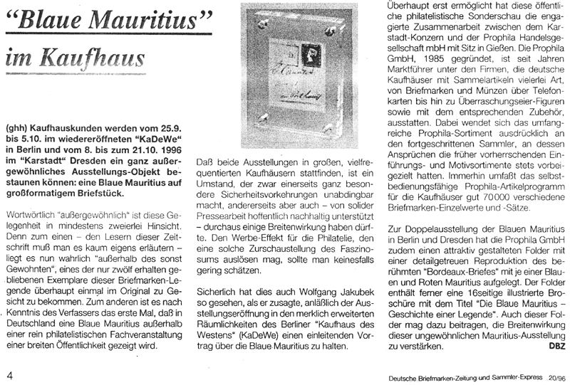 25.09.1996 "Blaue Mauritius" im Kaufhaus - Deutsche Briefmarken-Zeitung (DBZ) 20/96